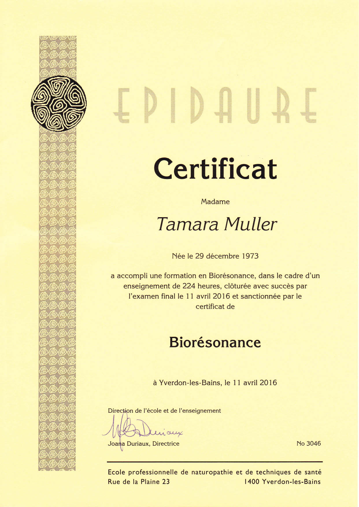 * avril 2016 : certificat de Biorésonance - EPIDAURE (Yverdon les Bains)